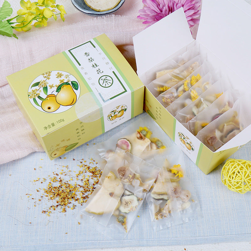 Each sip delivers a balanced combination of sweet pear, floral osmanthus, and soothing herbs. This tea is both flavorful and convenient, making it perfect for daily enjoyment or retail sales. Its aromatic, gentle taste ensures a comforting tea experience anytime.